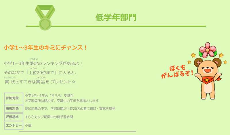 ※「すららカップ」とは:期間中2ヵ月間の「総学習時間」で、学年やエリアを問わずすべての「すらら」利用者同士が競い合う大会です。