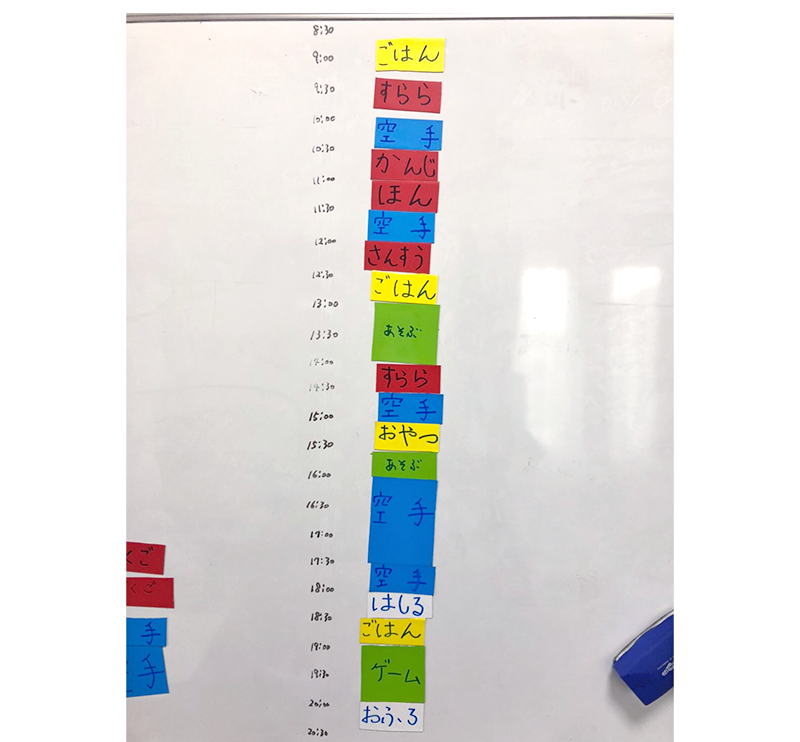 最初はスケジュールを意識するよう声がけなどサポートをしていましたが、自分で慣れてくると途中で予定を組みなおしたり修正も行っていたりしていたので、きちんと定着しているようでした。