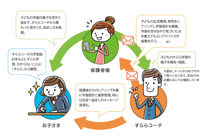 ※すららコーチとは?:すららコーチは家庭学習で見守り励ます保護者様の努力を支えるサポーター。現役の塾の先生がその経験と知識を活かして、学習習慣の身に付け方を始めとした学習に関する悩みや、基礎学力、成績を上げるための学習設計をサポートします。