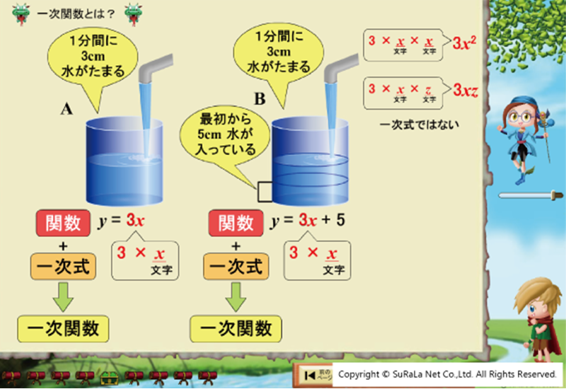 アニメーションキャラクターが、語りかけながらわかりやすく説明するレクチャー、さらに、自動でつまずきが診断されて克服できるプログラムを搭載したドリルなど、楽しく学習習慣を身につけながら成績向上を目指せる仕組みが満載です。
