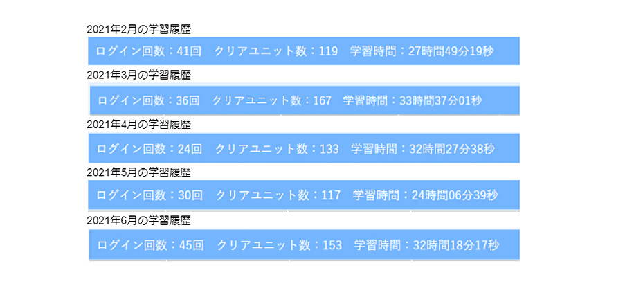 お子さまの学習履歴です。毎月30時間前後の学習をされていることがよくわかります。