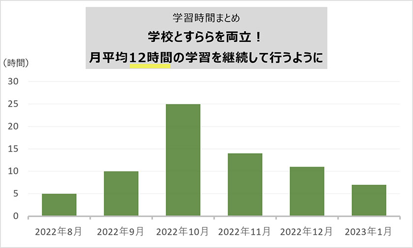 月平均12時間以上の学習をクリアしており、多い月は25時間以上の学習を行っています。