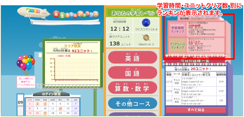 学習時間・ユニットクリア数 別にランキングが表示モチベーション管理の1つとして使用可能