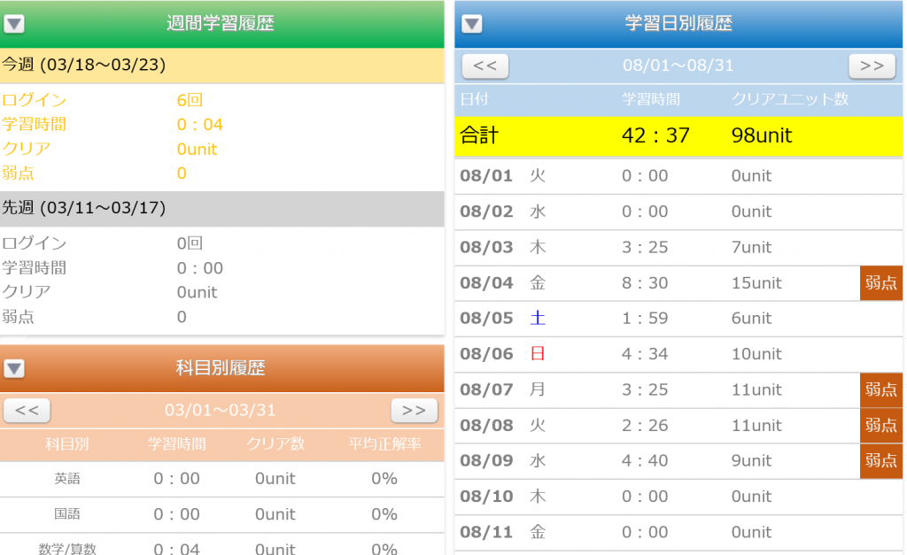 Hさんの2017年8月の学習履歴(保護者管理画面より)