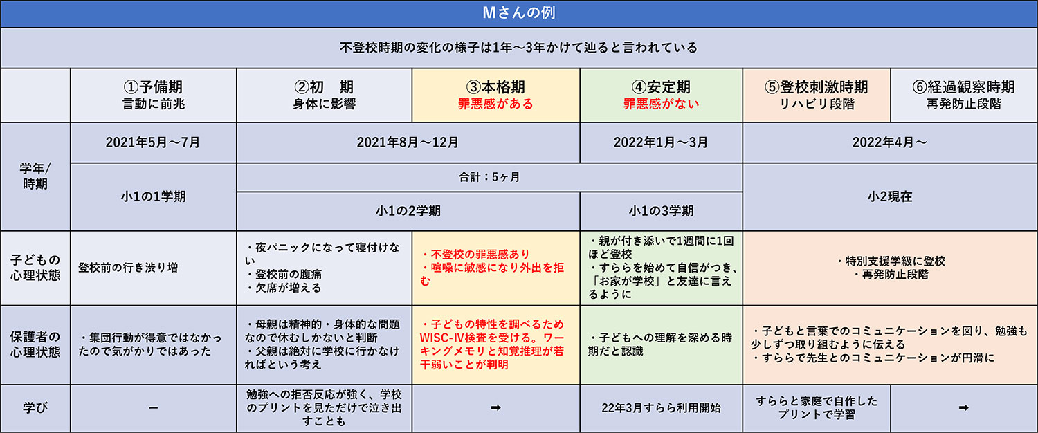 行き渋りをし始めた頃は勉強への拒否反応が強く、学校のプリントを見ただけで泣き出すこともありました。また学校へ行ってないことに対して罪悪感を抱いており、本人に負担がかかっていたと思います。