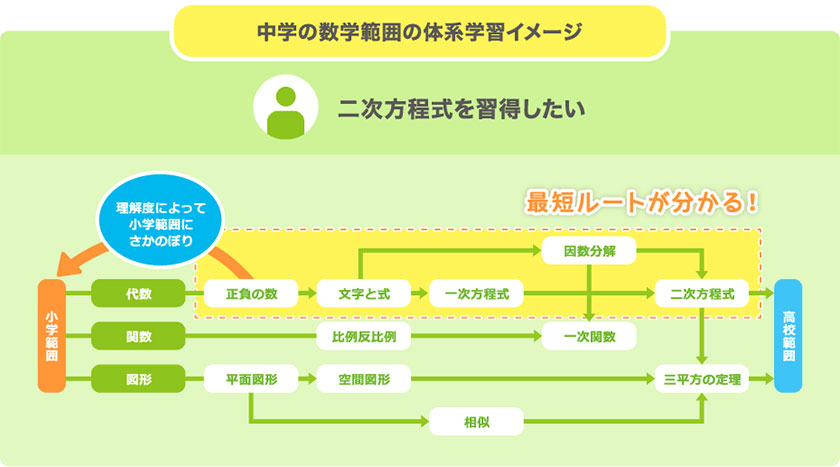 例えば、中学の数学の場合は1学期に代数、2学期に関数、3学期に図形…という感じで学びますが繋がりが無いため理解できなかった部分で行き詰まってしまいます。すららの体系学習では、学習の最短ルートが分かるので本当に助かっています。