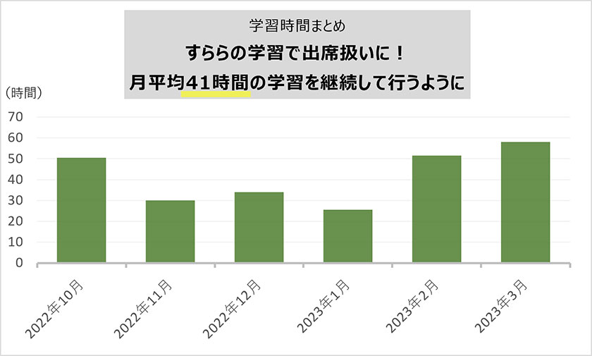 月平均41時間以上の学習をクリアしており、多い月は57時間以上の学習を行っています。